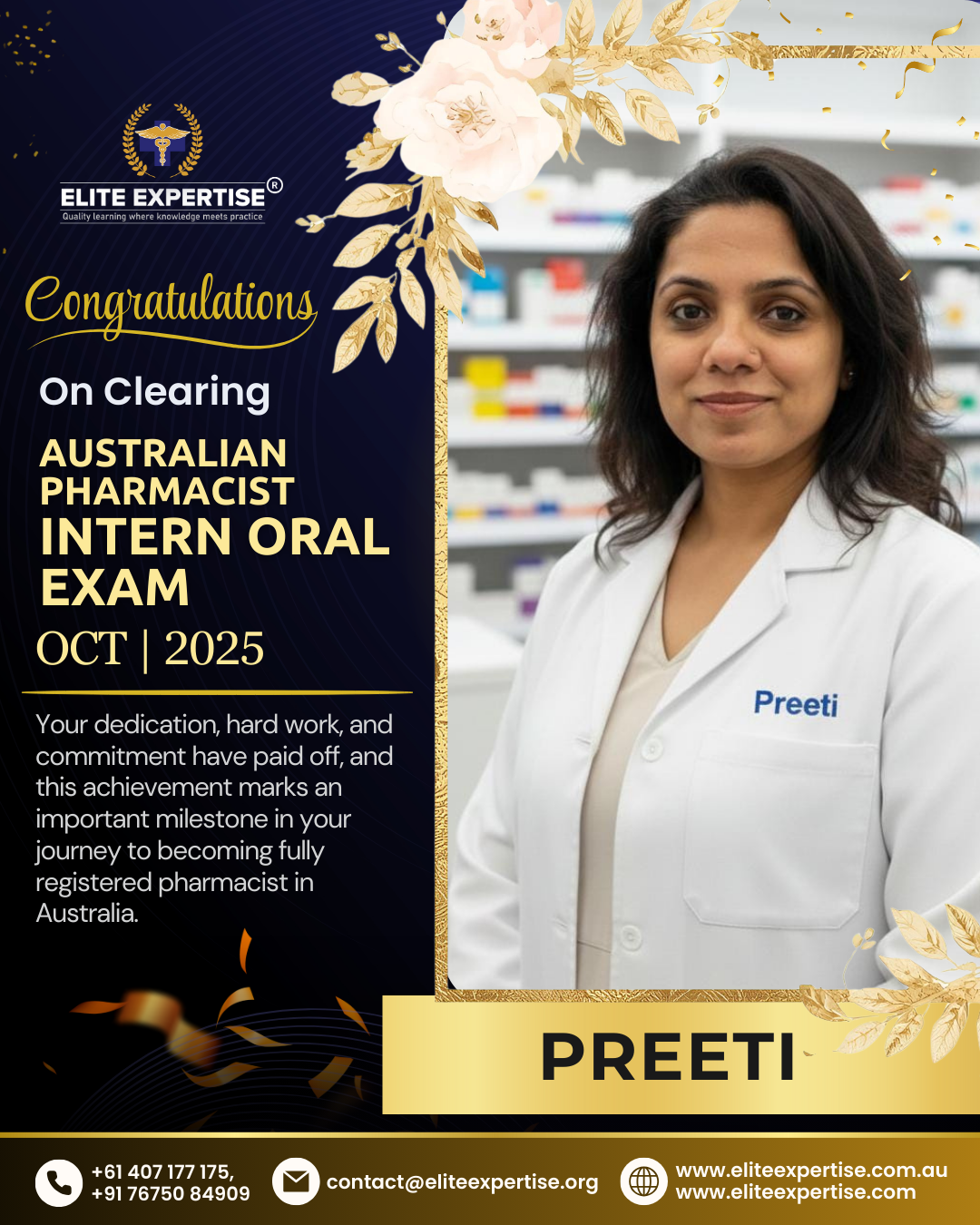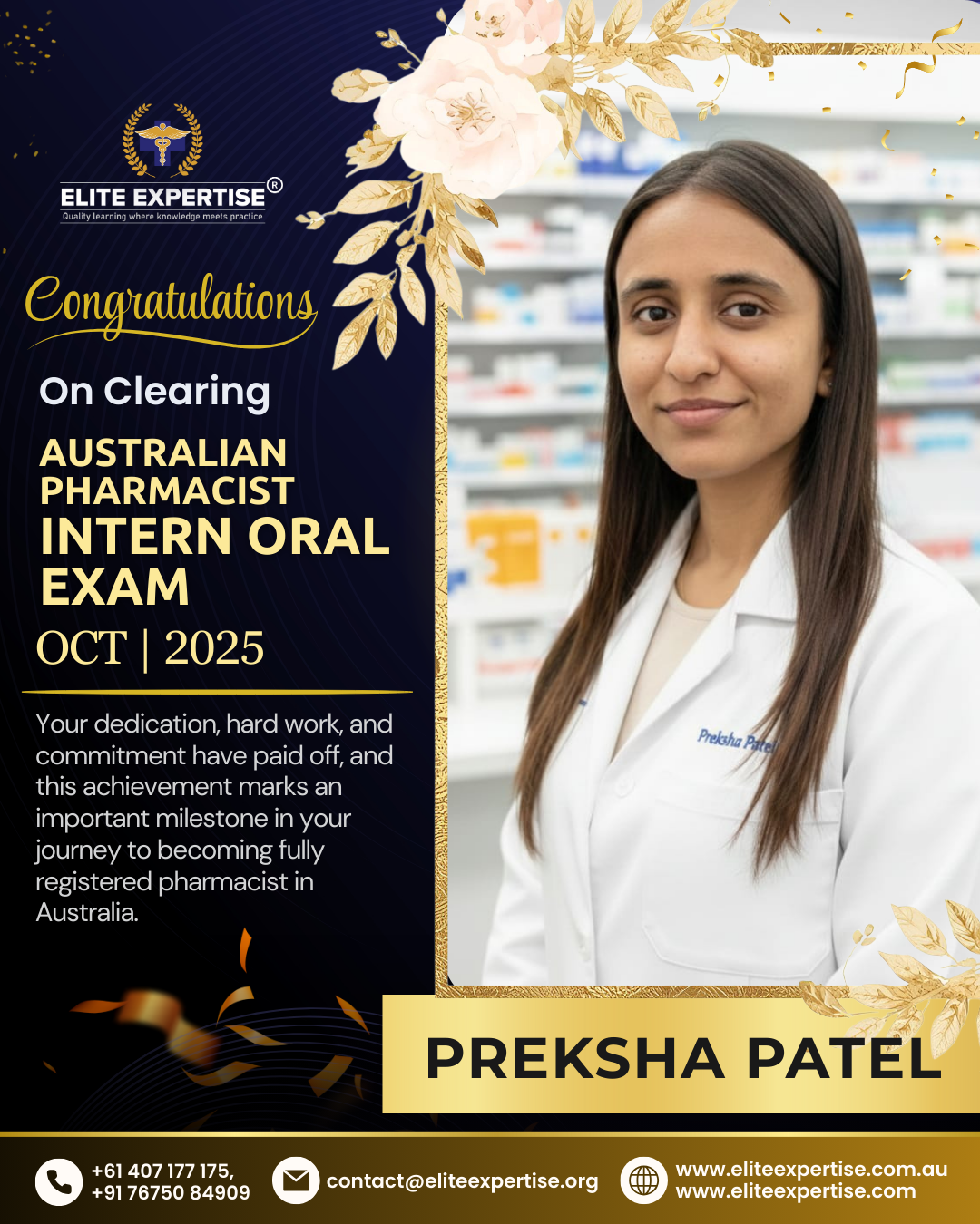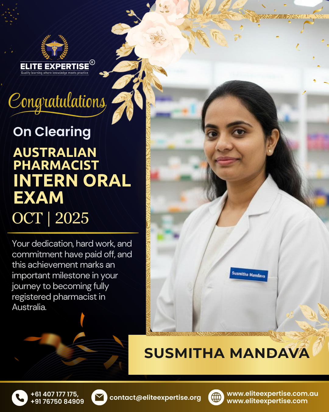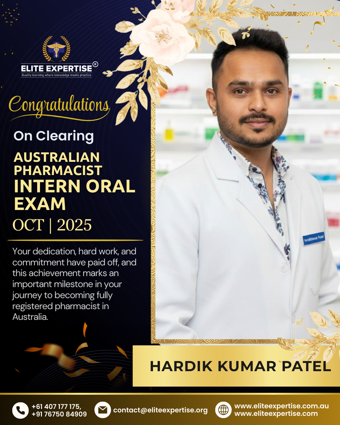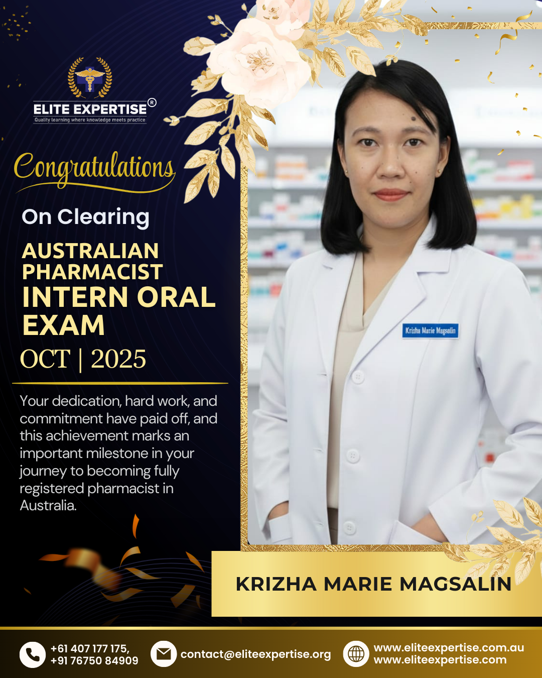 We are thrilled to announce that Elite Expertise students have achieved outstanding success in the OPRA 2025 examination! Your dedication, perseverance, and hard work have paid off brilliantly. Each success story represents countless hours of preparation, unwavering determination, and the pursuit of excellence. We are incredibly proud of every student who has cleared this significant milestone in their pharmacy career. Congratulations to all our successful candidates – your achievement inspires us all. Welcome to the next chapter of your professional journey in Australia!